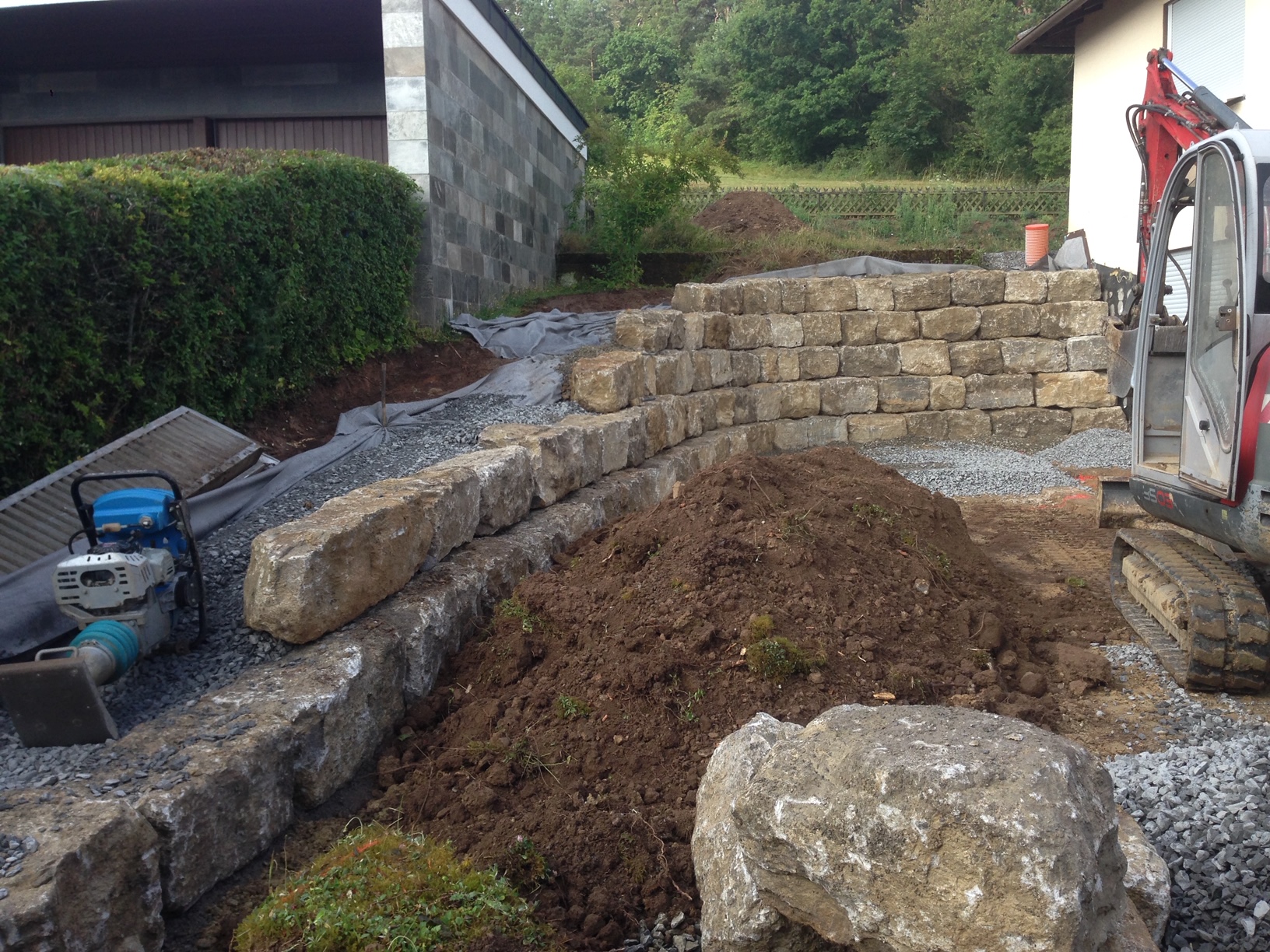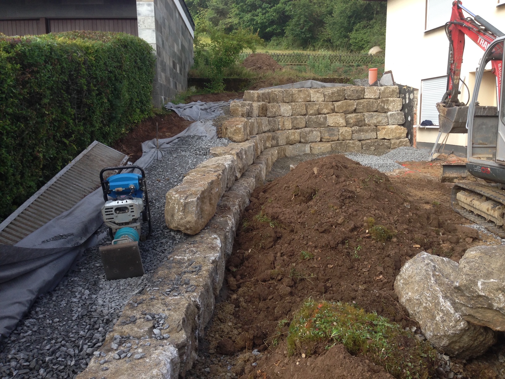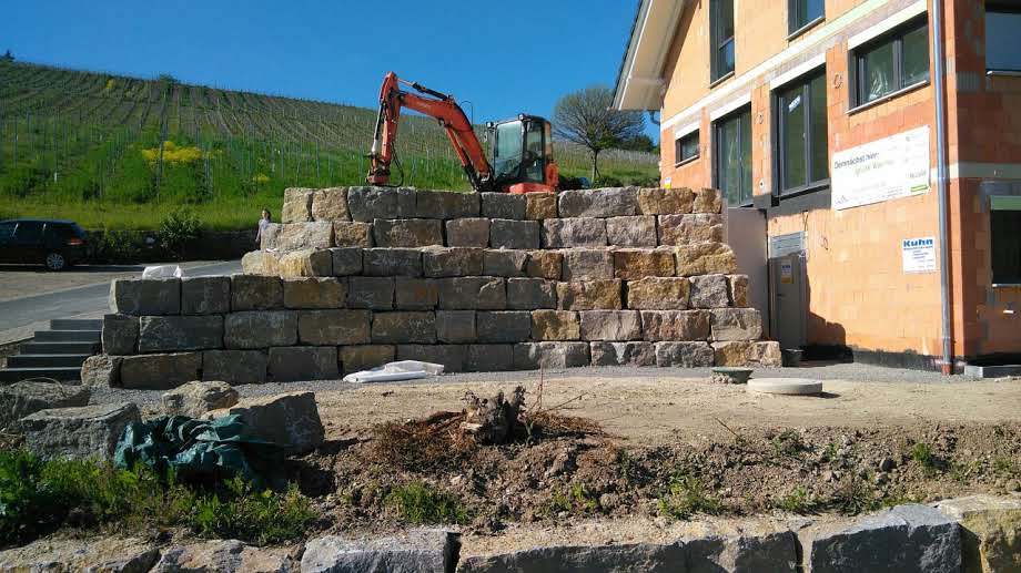 Im Bereich Hangsicherung stehen wir Ihnen mit unserem leistungsstarken Fuhr- und Maschinenpark und langjähriger Erfahrung zur Verfügung. Abhängig von Ihren Wünschen und den baulichen Anforderungen ist eine Hangsicherung unter Verwendung unterschiedlicher Materialien möglich. Für große Hangflächen zum Beispiel haben sich Betonfertigteile und Ortbeton bewährt. Kleinere Hänge, etwa an Terrassen, lassen sich hervorragend mit Sandsteinfindlingen, Kalkbruchquadern oder sowie Pflanzringen und Natursteinmauerwerk befestigen. Wir beraten Sie kompetent bei der Auswahl geeigneter Materialien.